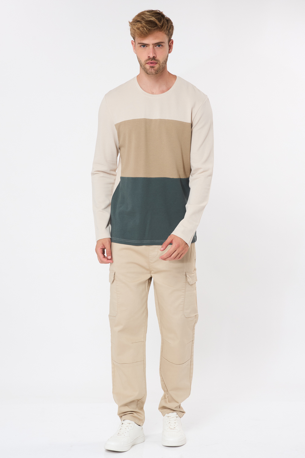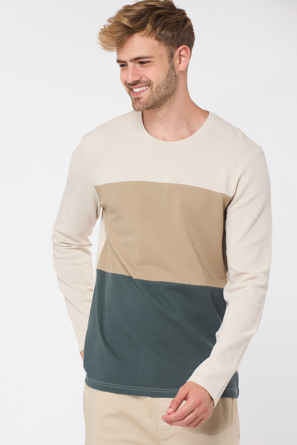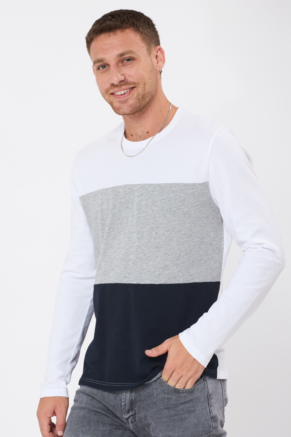 חולצת טי מבד טקסטורת פופקורן צווארון עגול שילוב צבעים קולור בלוק מלפנים