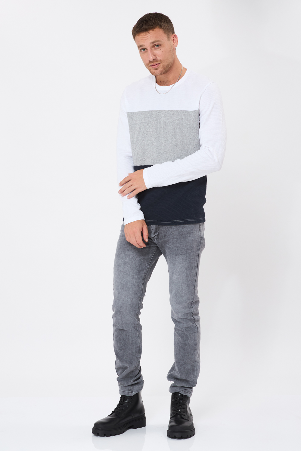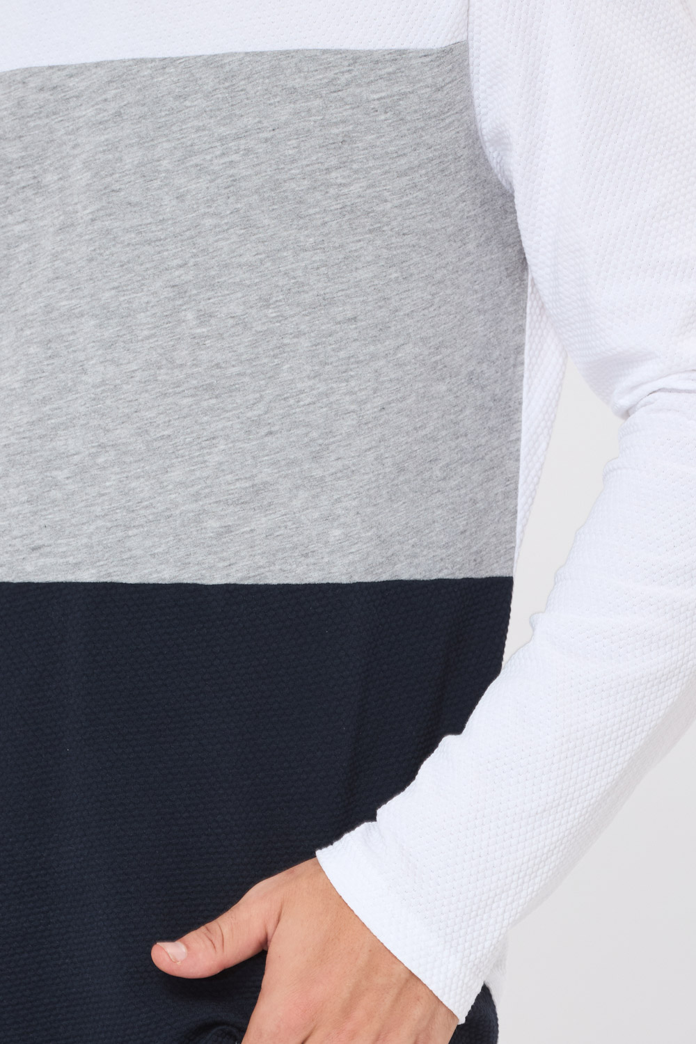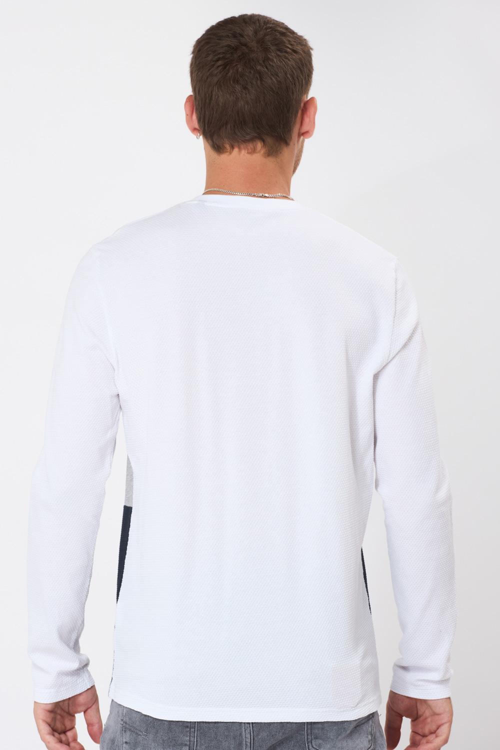 חולצת טי מבד טקסטורת פופקורן צווארון עגול שילוב צבעים קולור בלוק מלפנים