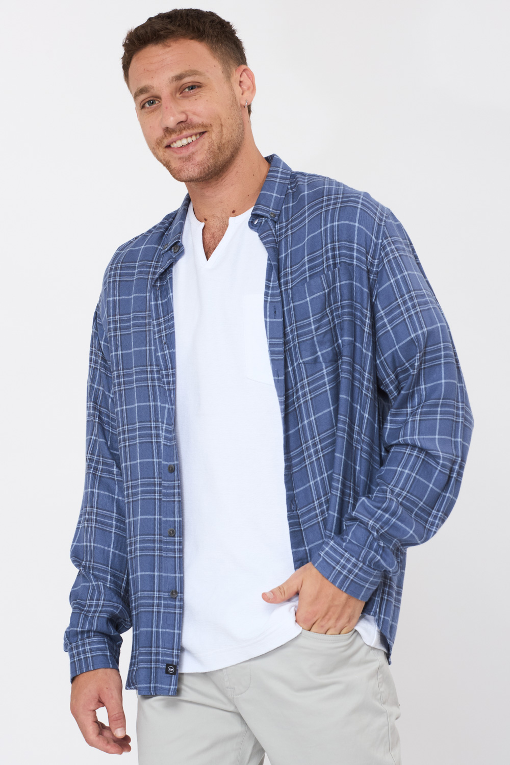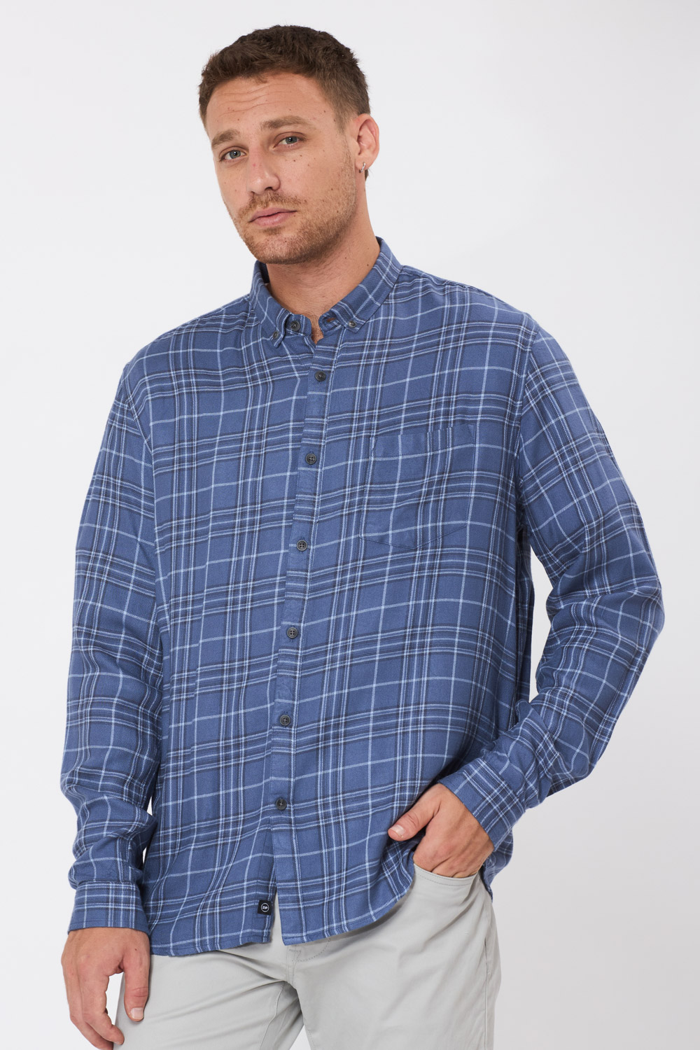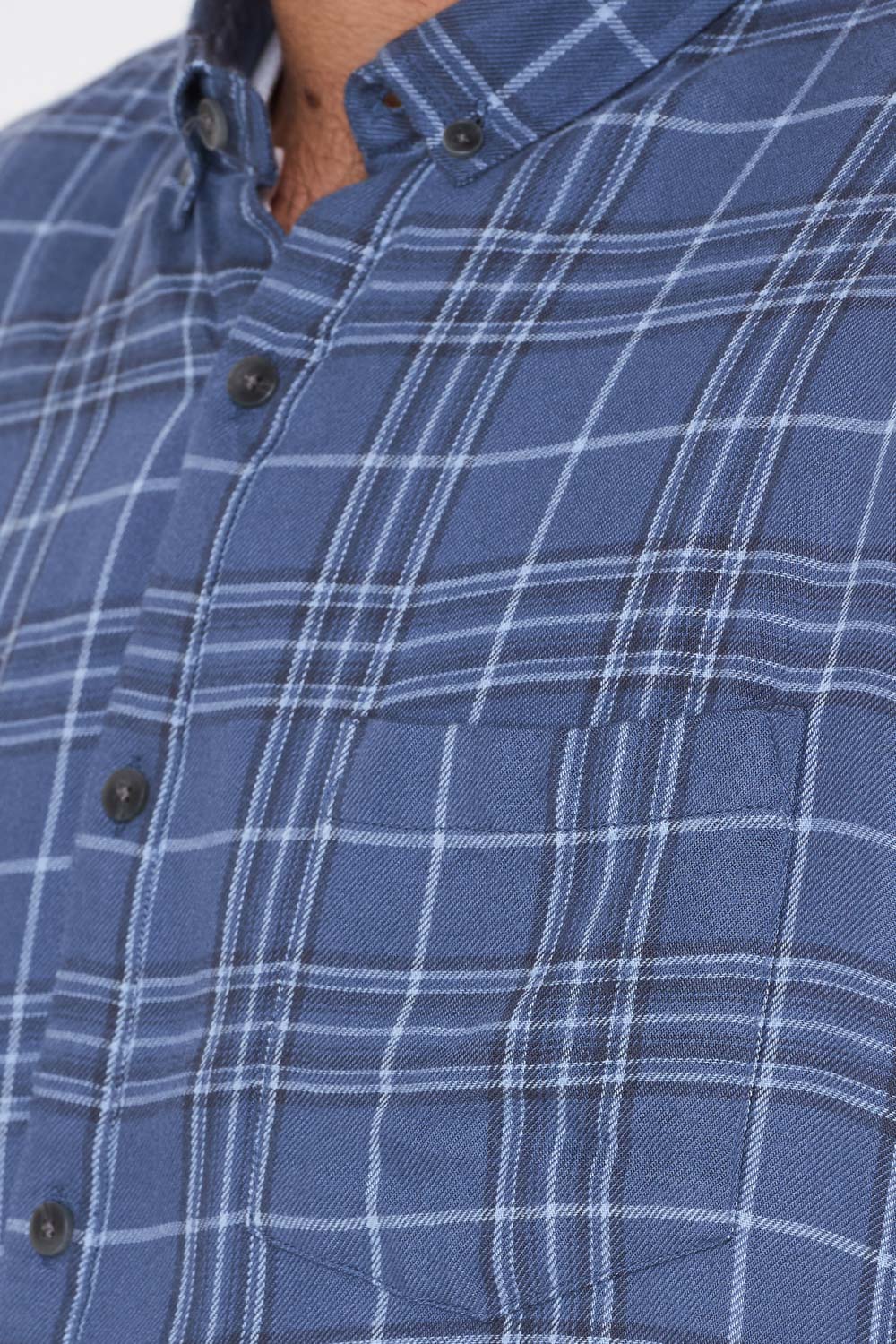 חולצה מכופתרת בד משבצות פלנל בגווני כחול שילוב כיס קדמי גזרה רחבה comfort fit