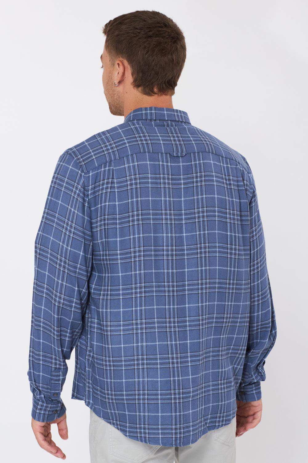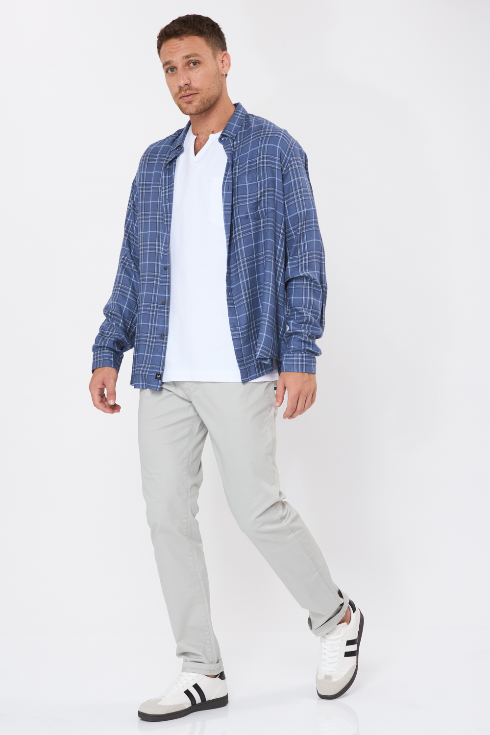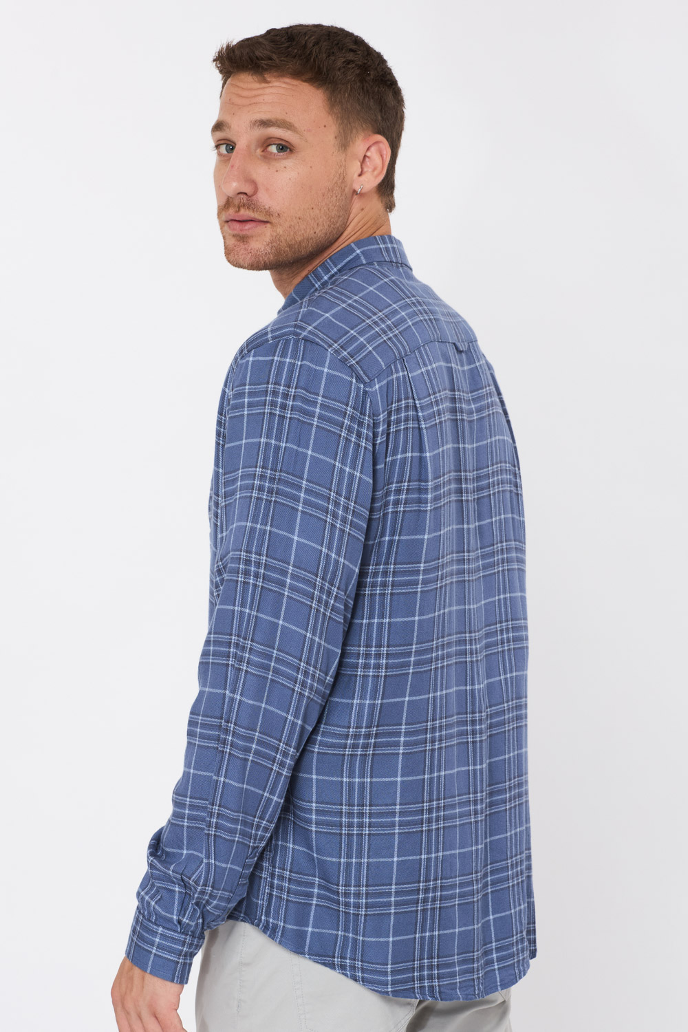 חולצה מכופתרת בד משבצות פלנל בגווני כחול שילוב כיס קדמי גזרה רחבה comfort fit