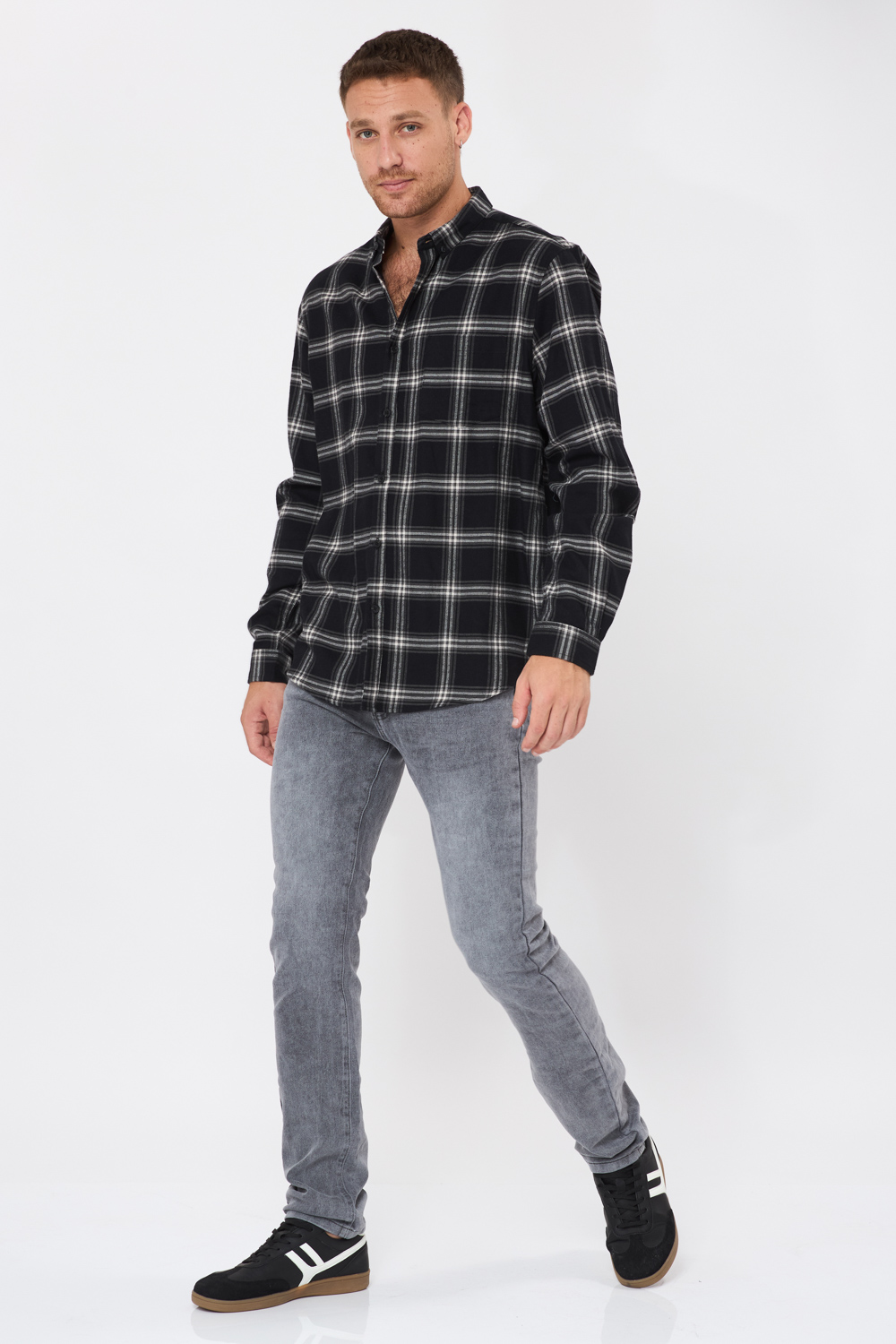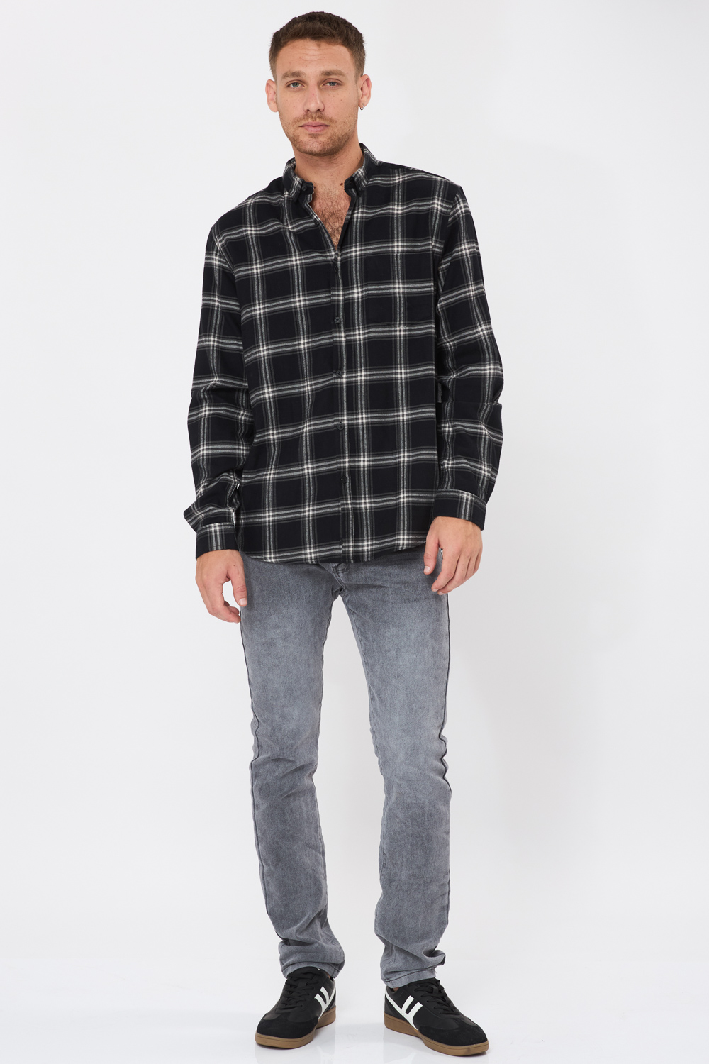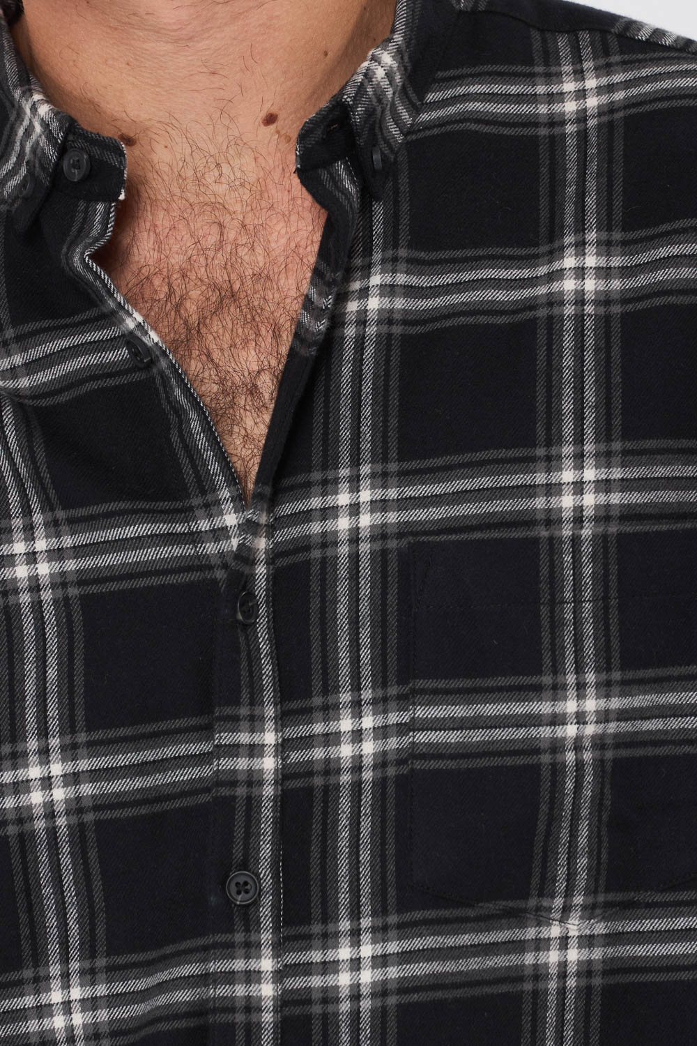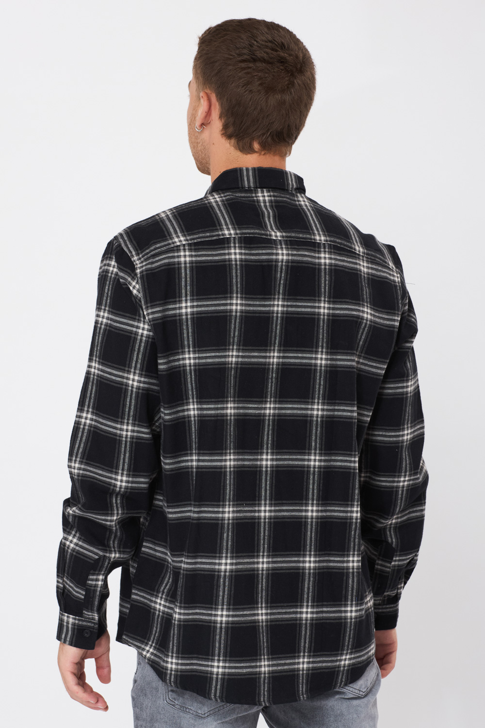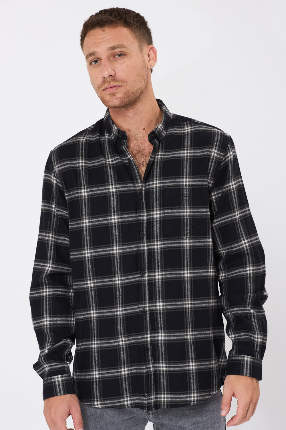 חולצה מכופתרת בד משבצות פלנל בגוון שחור שילוב כיס קדמי גזרה רחבה comfort fit