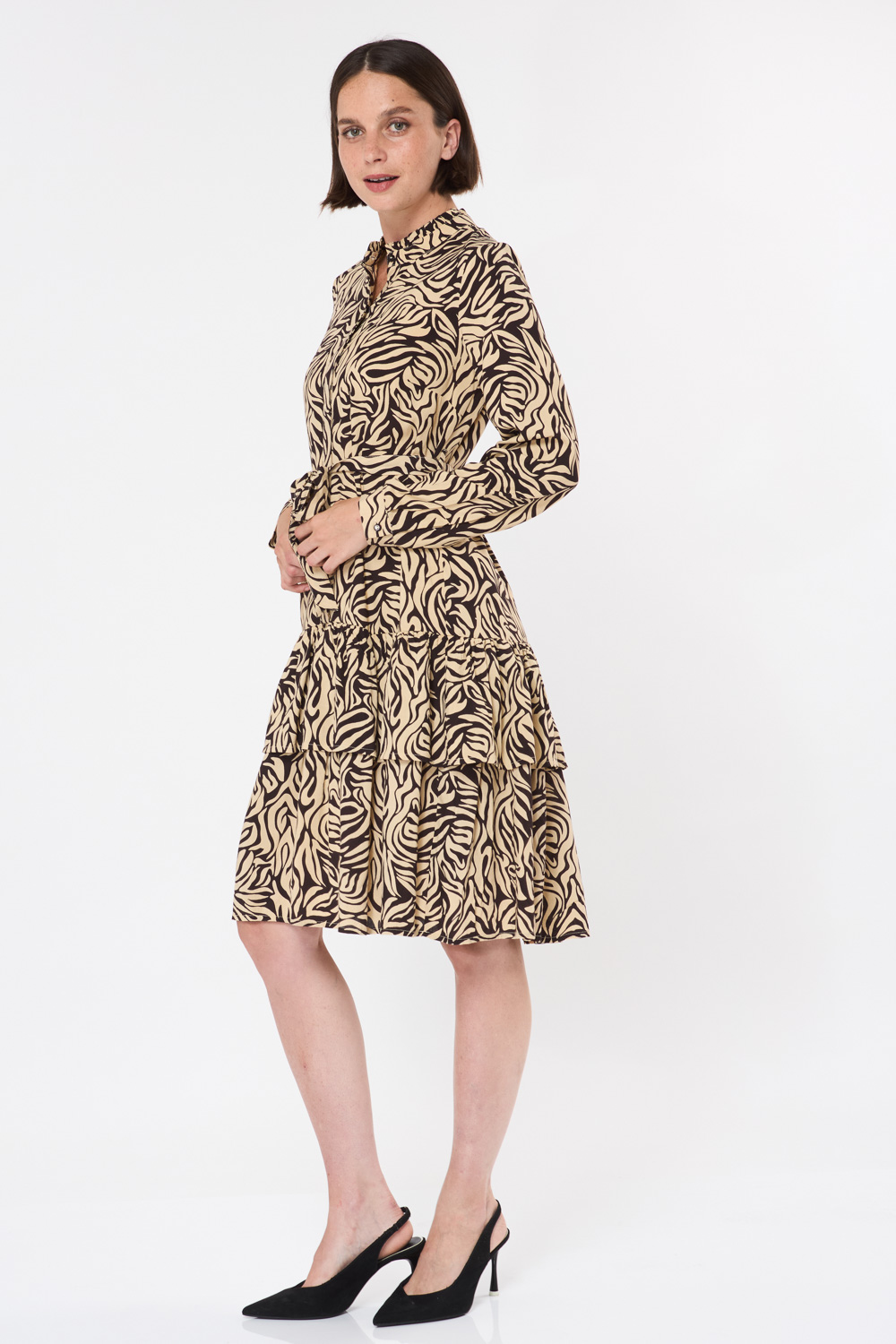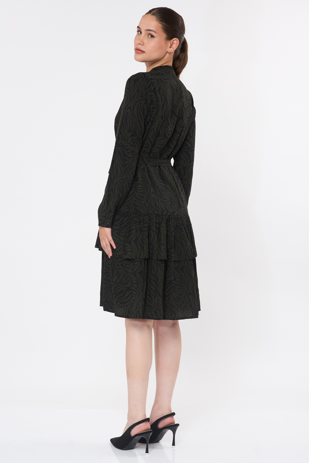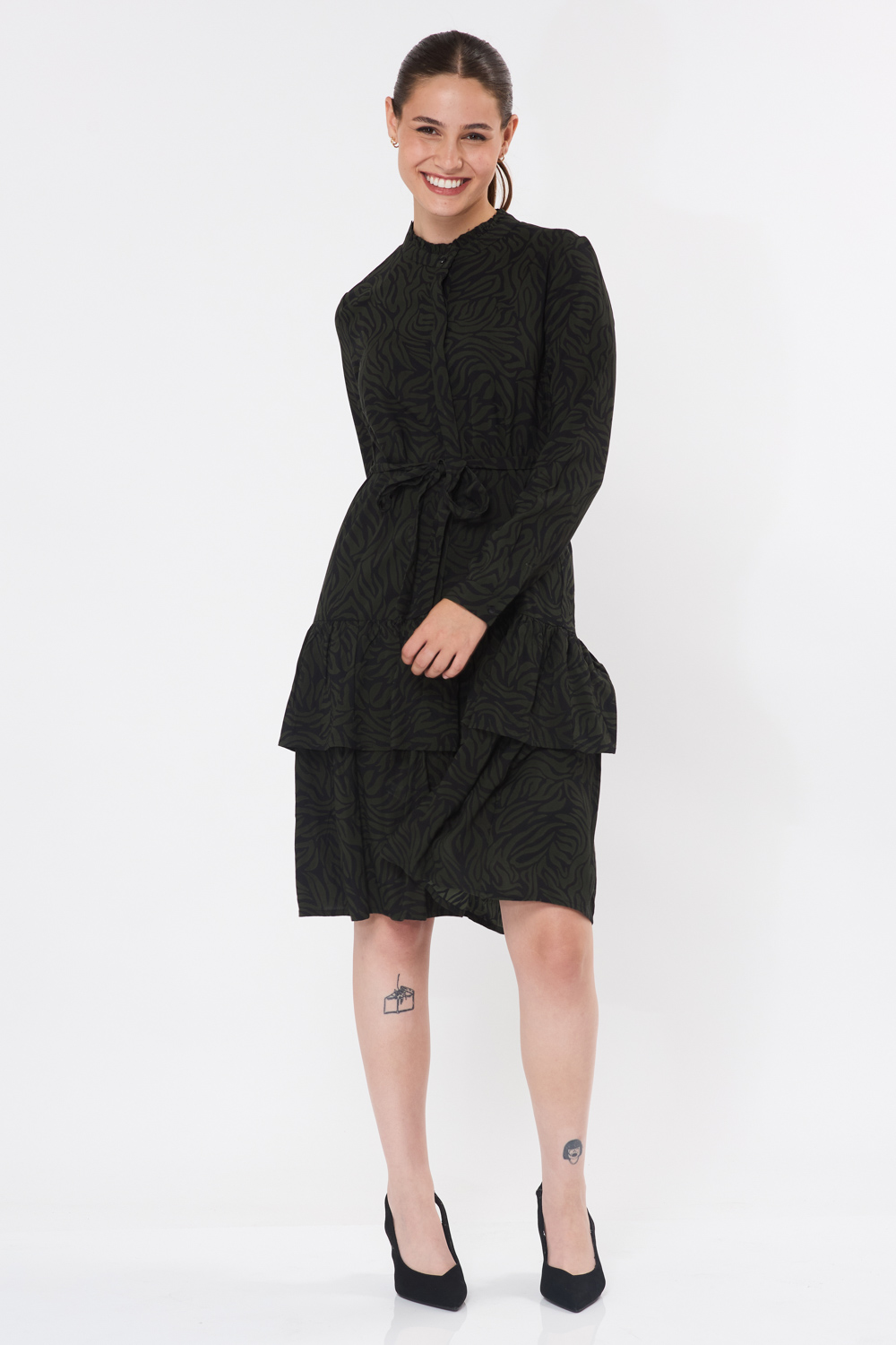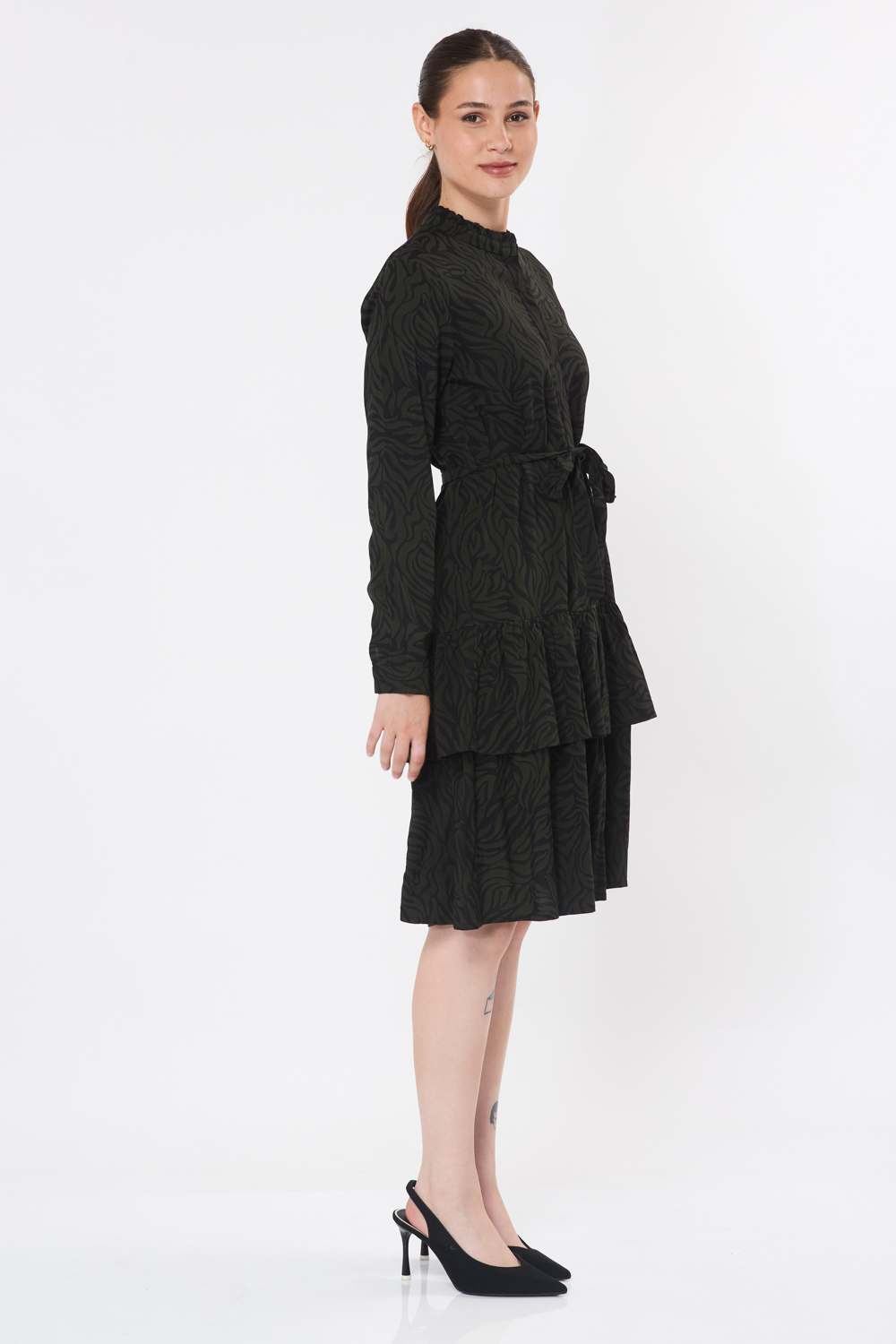 שמלת קומות מודפסת וולאנים בסיומת הצווארון רכיסת כפתורים נסתרת חגורת בד לקשירה במותן