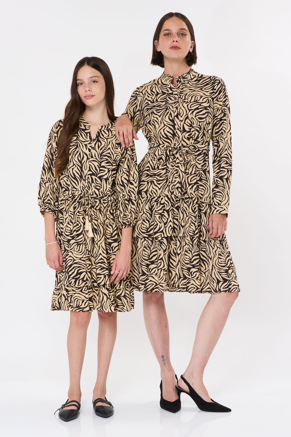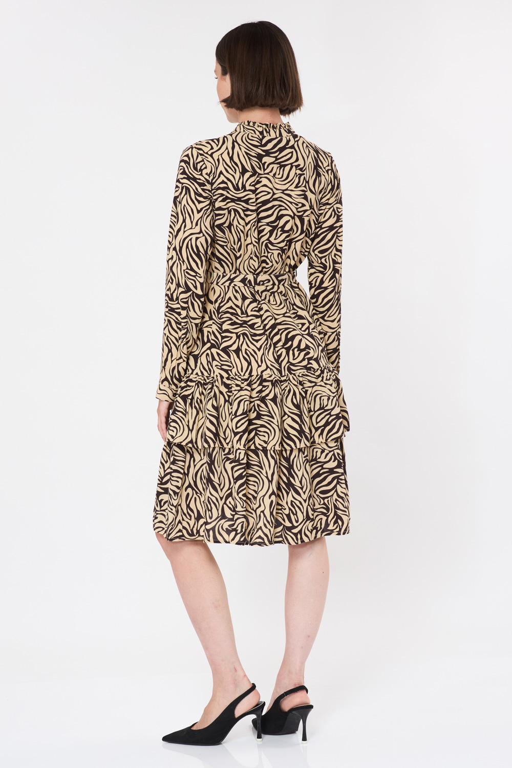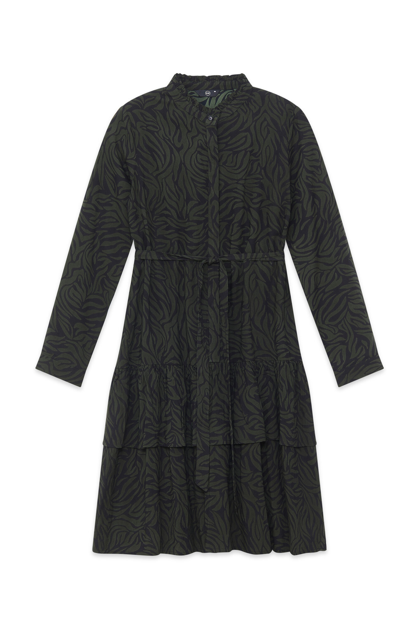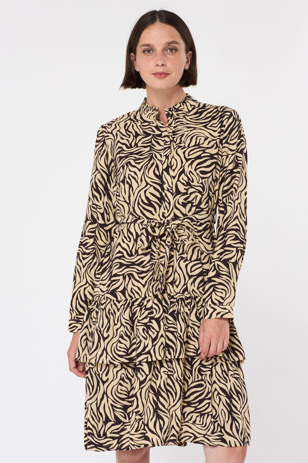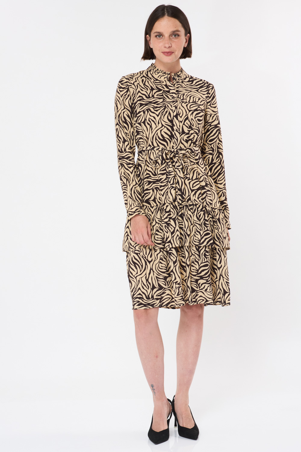 שמלת קומות מודפסת וולאנים בסיומת הצווארון רכיסת כפתורים נסתרת חגורת בד לקשירה במותן